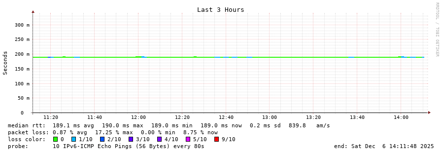 14 > 2001:4350:1:1::ff90 (2001:4350:1:1::ff90) [AS5438] 189.359ms 189.443ms 189.449ms
