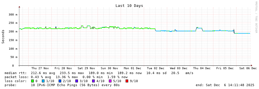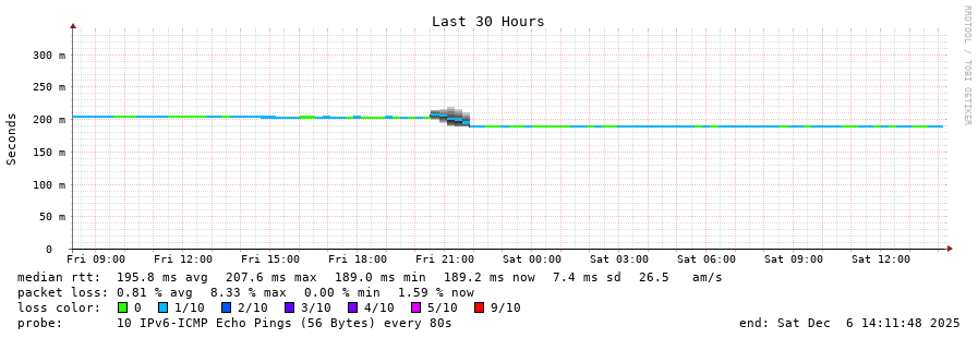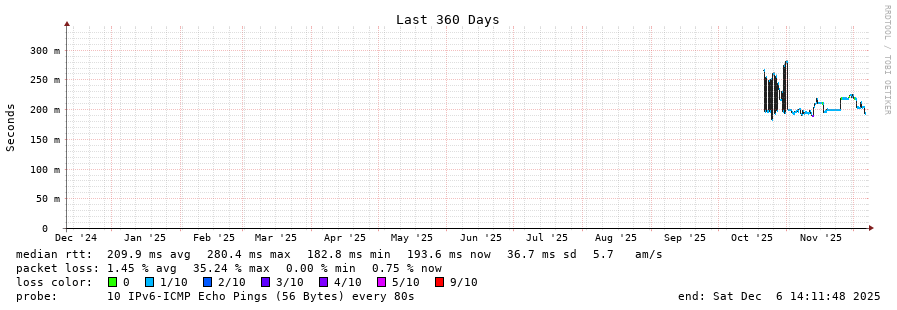 traceroute to 2001:4350:1:1::ff90 (2001:4350:1:1::ff90), 30 hops max, 80 byte packets - Generated at 2025-12-06 14:00:02