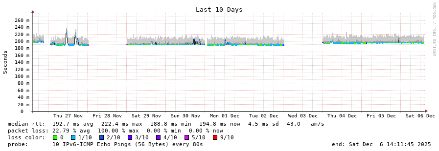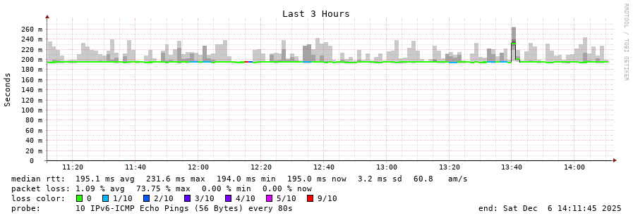 10 > 2001:470:1f13:814:1ad6:c7ff:fe2a:502 (2001:470:1f13:814:1ad6:c7ff:fe2a:502) [AS6939] 194.647ms 194.394ms 194.574ms