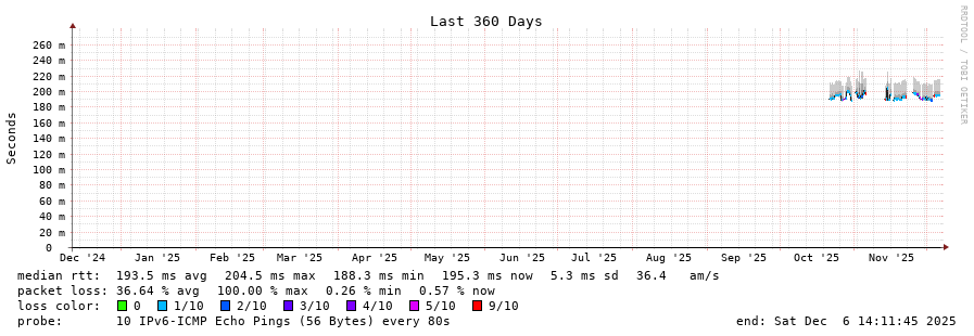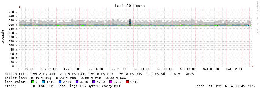 traceroute to 2001:470:1f13:814:1ad6:c7ff:fe2a:502 (2001:470:1f13:814:1ad6:c7ff:fe2a:502), 30 hops max, 80 byte packets - Generated at 2025-12-06 14:00:02