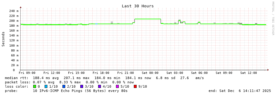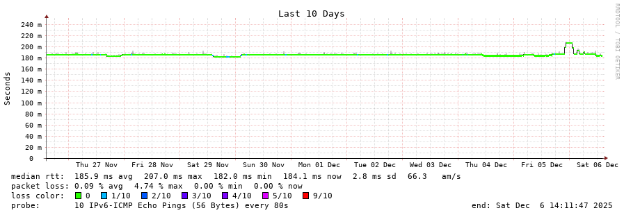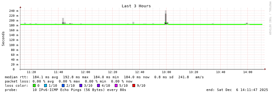 traceroute to 2001:67c:1e0:0:c225:e9ff:fea8:6a0a (2001:67c:1e0:0:c225:e9ff:fea8:6a0a), 30 hops max, 80 byte packets - Generated at 2025-12-06 14:00:02