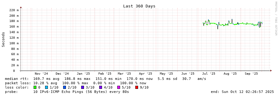 traceroute to 2a00:c560:c0c0:1a1a::9 (2a00:c560:c0c0:1a1a::9), 30 hops max, 80 byte packets - Generated at 2025-10-12 02:15:01