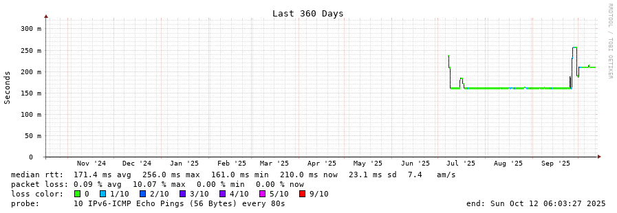 traceroute to 2402:1f00:8002:100::f72 (2402:1f00:8002:100::f72), 30 hops max, 80 byte packets - Generated at 2025-10-12 05:45:01